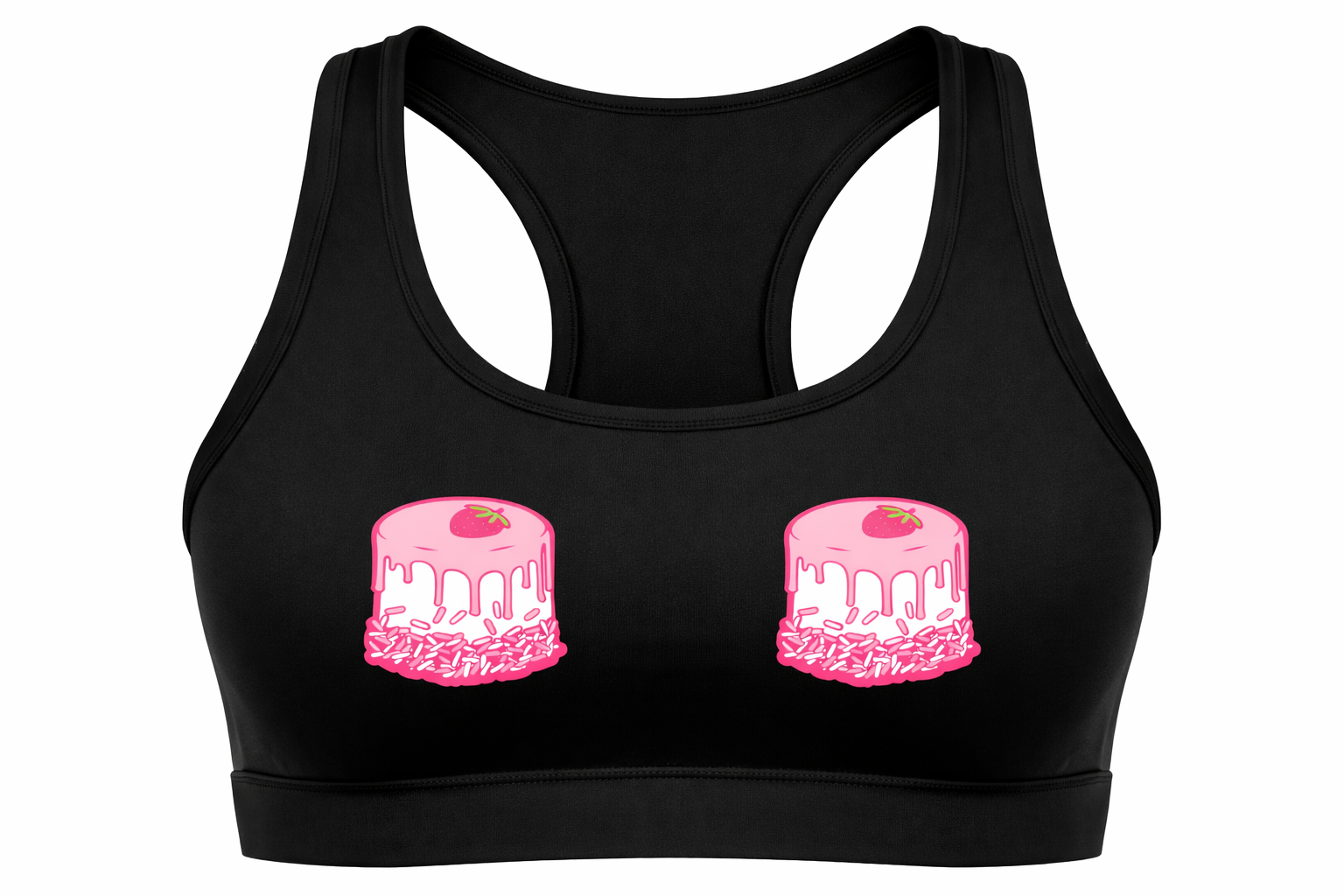 Elevate your activewear with the Strawberry Drip Deluxe Sports Bra. Designed for both performance and style, this piece features the signature strawberry drip cake logo for a bold yet feminine touch. Made with soft, supportive stretch fabric, it offers a flattering fit while keeping you comfortable during workouts or everyday wear.
